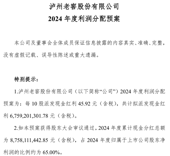 此外,继2024年12月晓谕履行2024年中期利润分拨,悉数派发现款红利约20亿元后,2025年4月28日,泸州老窖再公布2024年度利润分拨预案。