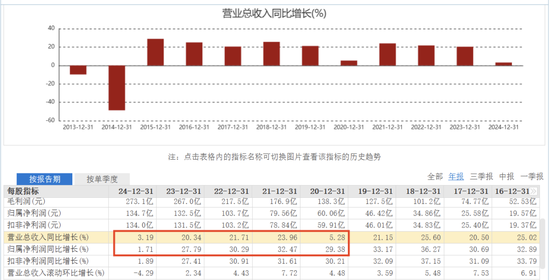 曾以年均20%增速决骤的泸州老窖,2024年却须臾“失速”——全年营收同比仅增3.19%,净利润增速更是创下十年新低。