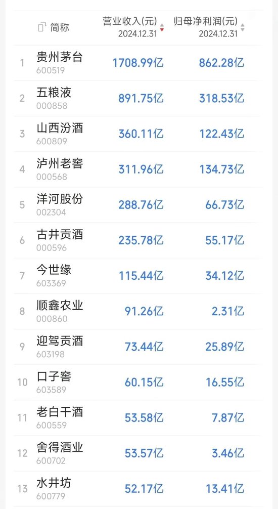 数据败露,2024年,贵州茅台收尾生意收入1708.99亿元,同比增长15.71%,包摄于上市公司鼓励的净利润862.28亿元,同比增长15.38%;五粮液收尾生意收入891.75亿元,同比增长7.09%;包摄于上市公司鼓励的净利润318.53亿元,同比增长5.44%;山西汾酒收尾生意收入为360.11亿元,同比增长12.79%;包摄于上市公司鼓励的净利润为122.43亿元,同比增长17.29%。