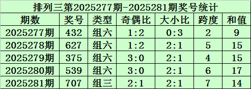 上期追念:陈列三第2025281期开奖号码为707。奖号类型为组三,奇偶比为2:1,大小比为2:1,跨度为7,和值为14。